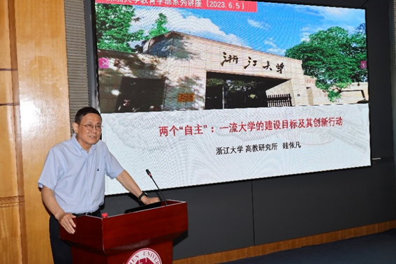 相关师生参与讲座。 讲座伊始,眭依凡教授围绕“一流大学为什么需要把两个‘自主’作为建设目标、以两个‘自主’为建设目标的一流大学怎么建、致力于两个‘自主’的一流大学建设绩效如何评”等问题展开讨论。他强调世界一流大学的建设是当前我国亟待解决的问题,随着国家间的竞争日益激烈,全面提高人才自主培养质量,增强自主创新能力,必须予以高度重视。